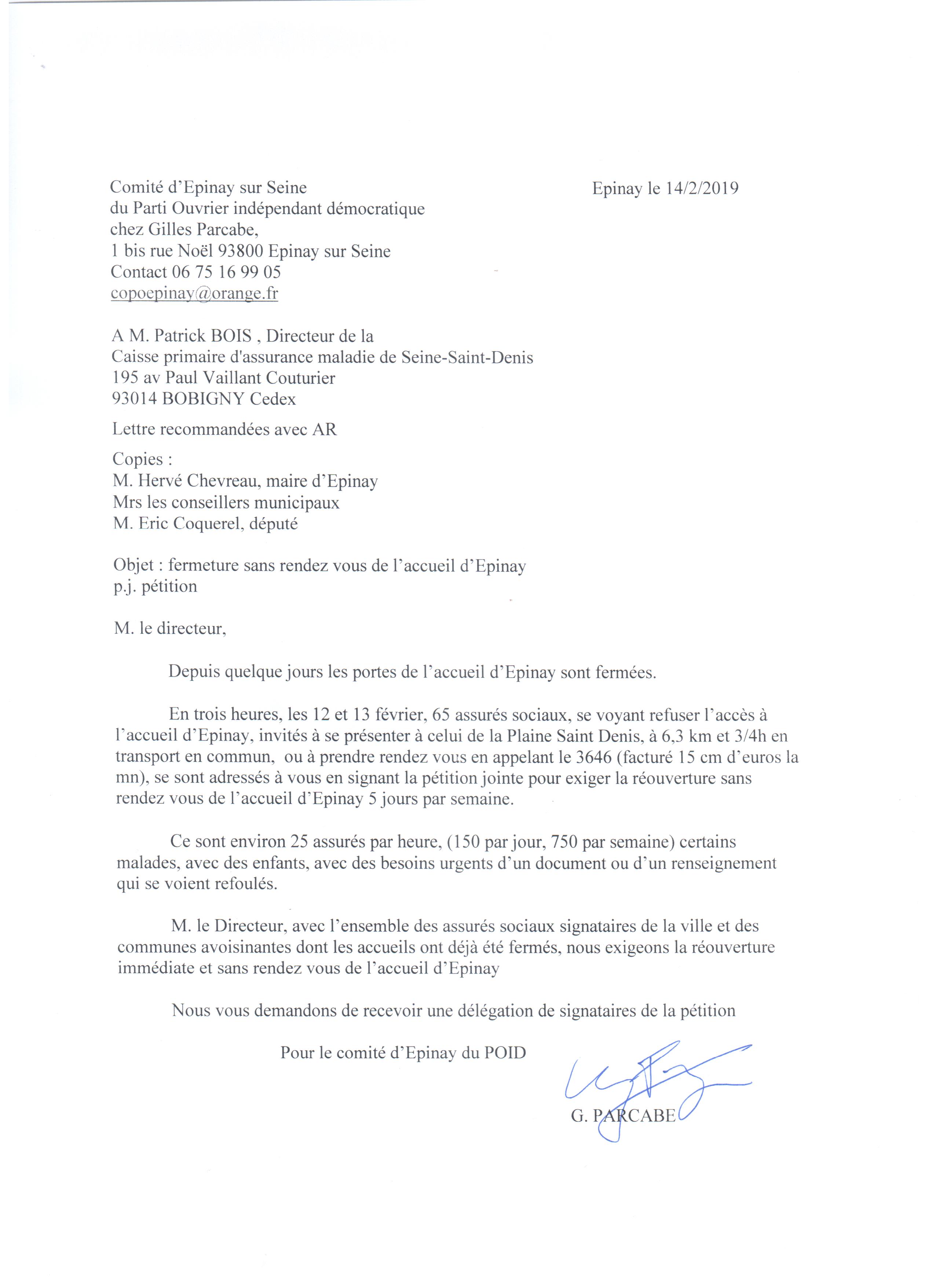 Nous invitons les assurés sociaux à signer la pétition suivante à s’organiser en « comité de défense de l’accueil Sécu d’Epinay, à organiser une délégation auprès du directeur départemental »