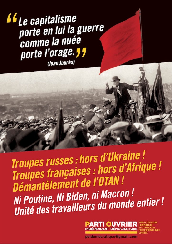 « Nous, travailleurs, jeunes, militants du mouvement ouvrier et démocratique venus de 47 pays et de tous les continents, nous reprenons à notre compte la phrase que prononça Jean Jaurès, figure historique du socialisme international à la veille du déclenchement de la guerre de 1914 : « Le capitalisme porte en lui la guerre comme la nuée porte l’orage. »