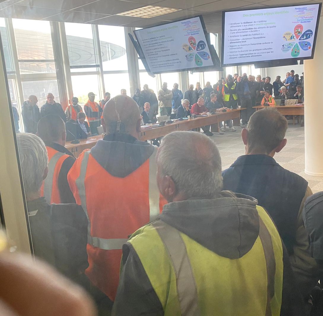 Des agents du siège et de tous les services ont fait le déplacement pour être présents dès 9h à la réunion. Les services techniques, venus de toute l’agglo, y étaient très nombreux et très en colère. Après s’être réunis dans la salle du Conseil de territoire qui leur était réservée au Rdc, les agents ont voté une mobilisation pour le matin même, et l’inscription du mouvement dans la durée par d’autres mobilisations, blocages et grèves. Ils ont envahi la réunion du bureau élargi des maires, élus et directeurs de Plaine Commune, qui avait lieu quelques étages plus haut, au 4ème.