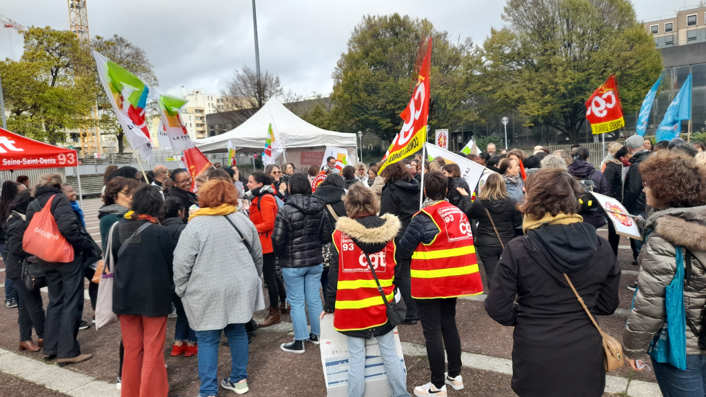 Quarante-cinq centres de PMI de Seine-Saint-Denis, soit 60 % du total, étaient fermés le lundi 7 novembre. Les salariés – souvent des salariées – étaient appelés à faire grève contre la réorganisation du temps de travail et à se rassembler devant la préfecture de Bobigny par les syndicats CGT et FSU et le syndicat des médecins de PMI.