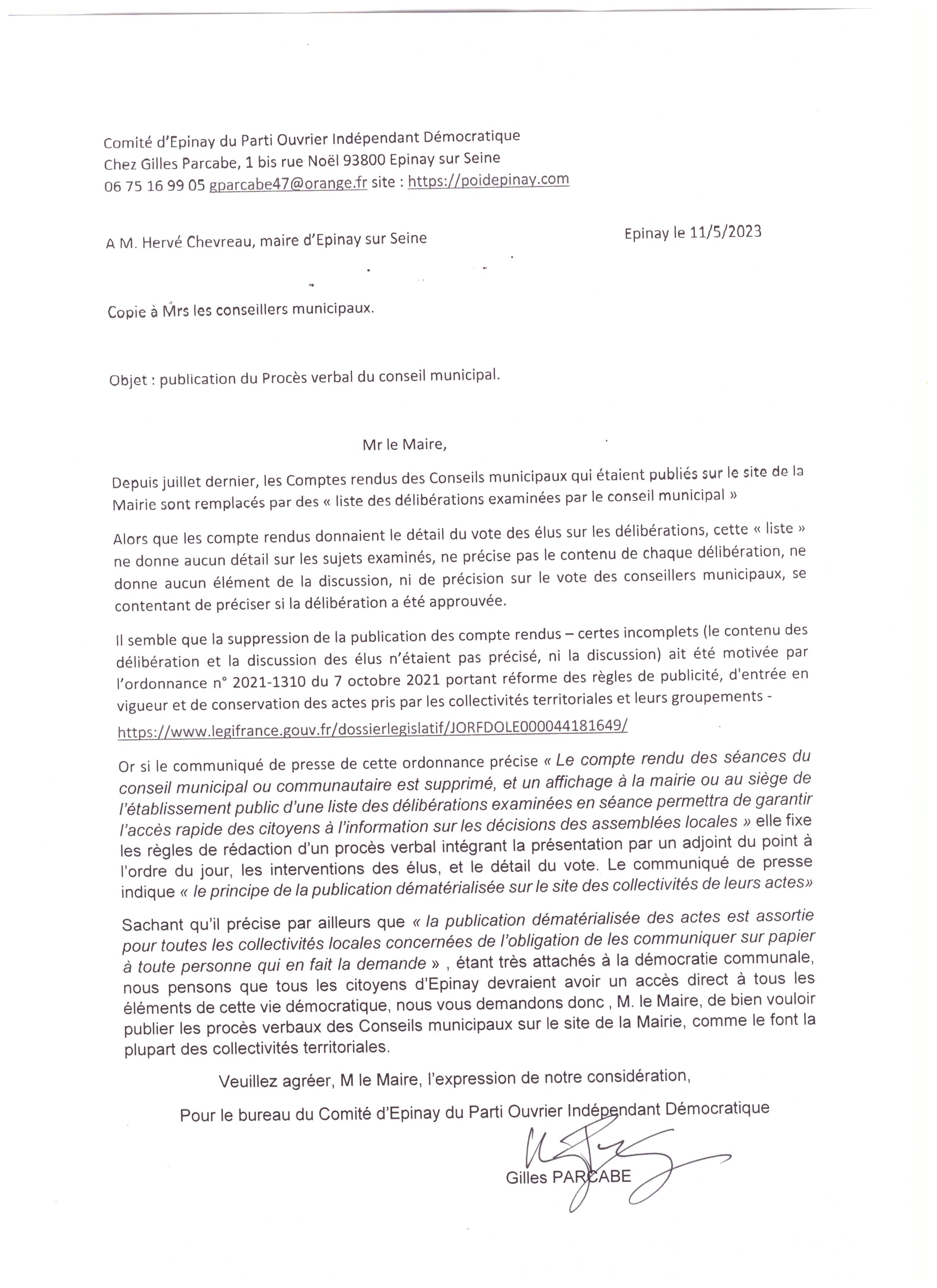 Sachant qu’il précise par ailleurs que « la publication dématérialisée des actes est assortie pour toutes les collectivités locales concernées de l’obligation de les communiquer sur papier à toute personne qui en fait la demande » , étant très attachés à la démocratie communale, nous pensons que tous les citoyens d’Epinay devraient avoir un accès direct à tous les éléments de cette vie démocratique, nous vous demandons donc , M. le Maire, de bien vouloir publier les procès verbaux des Conseils municipaux sur le site de la Mairie, comme le font la plupart des collectivités territoriales.