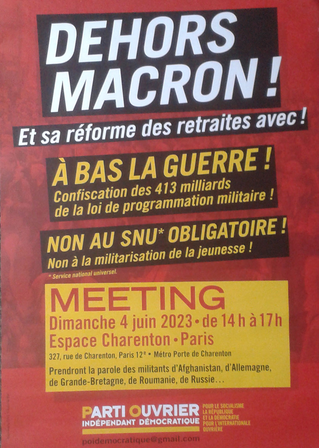 Sous la présidence de Daniel Gluckstein, secrétaire national du POID, prendront la parole notamment :