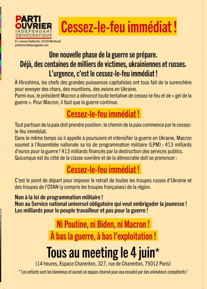 - – Confiscation des 413 milliards d’euros de la loi de programmation militaire pour les affecter aux besoins du peuple travailleur et de la jeunesse (écoles, hôpitaux, salaires, retraites) !