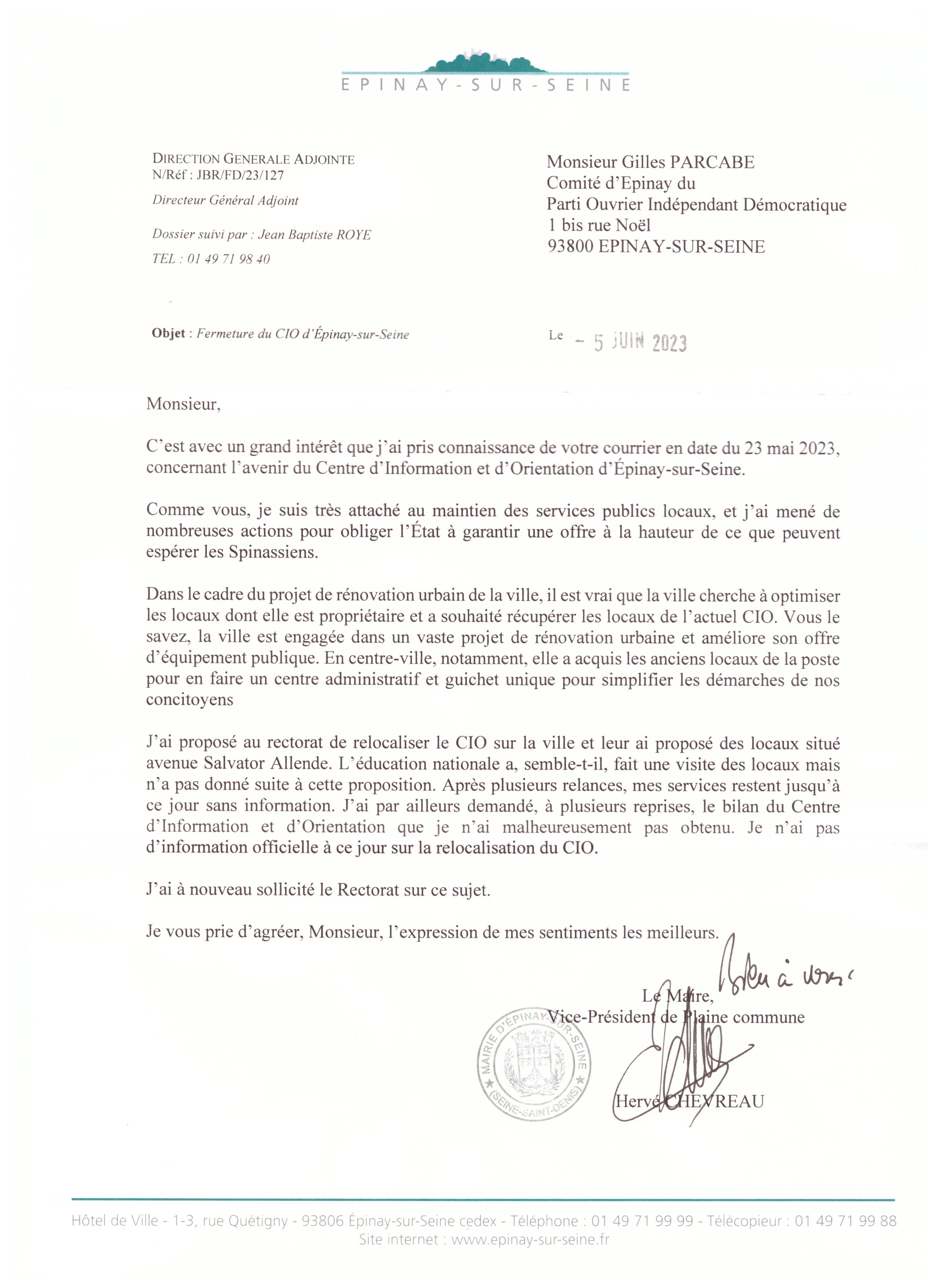 Nous maintenons notre position : pas de déménagement le 10 juillet ! Maintien du CIO dans ses locaux actuels (d’autant plus que la mairie n’en a pas besoin de suite pour son projet dont on ne sait ce qu’il est) le temps de trouver une solution à Epinay.