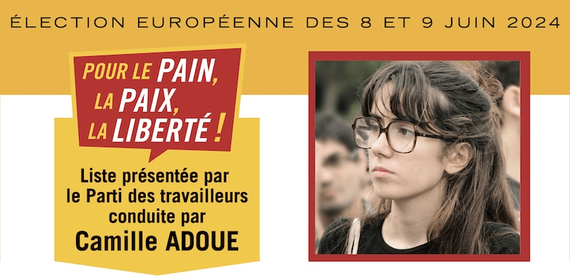 C’est ce gouvernement qu’il faut combattre. Parce que nous voulons un gouvernement des travailleurs, de la jeunesse et de la démocratie, en France comme à l’échelle européenne et à l’échelle internationale, nous rejetons les institutions antidémocratiques de l’Union européenne et de la Ve République. Partisans de la démocratie véritable, dont seuls les peuples peuvent définir la forme et le contenu, sans la moindre illusion sur les enjeux de cette élection européenne, pour construire et renforcer un authentique parti des travailleurs, nous présentons cette liste conduite par notre camarade Camille Adoue. Nos premiers candidats sur cette liste sont :