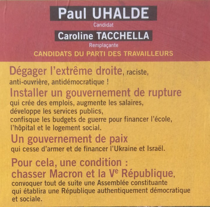 – Unité pour la rupture ouvrière ! Au cas où l’élection ne serait pas acquise au premier tour, alors, au second tour, le 7 juillet, les travailleurs et la population unis se rassembleront sur le mot d’ordre : « Pas une voix pour les candidats de l’extrême droite et ses alliés de droite et du camp macroniste,