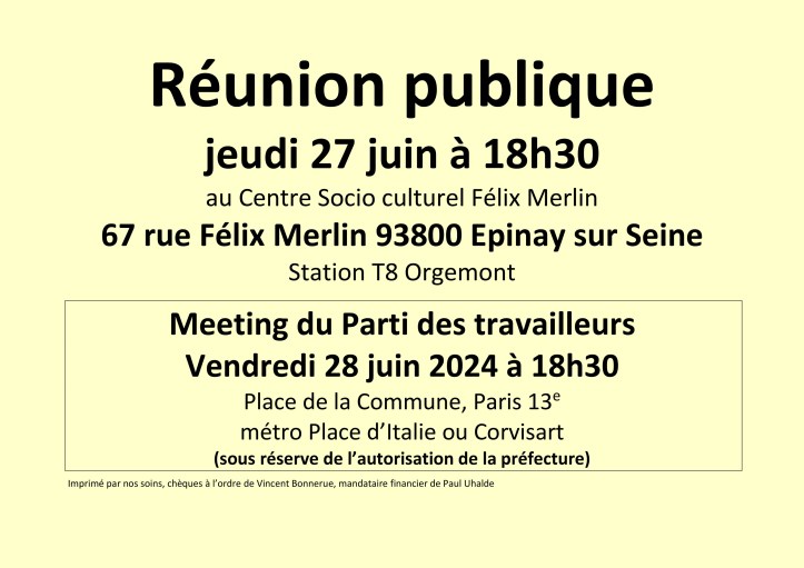 Travailleurs et jeunes des villes de Saint-Ouen, d’Épinay et de Saint-Denis, vous savez que, quel que soit le résultat des élections, il faudra rester organisés et mobilisés pour défendre les conquêtes sociales et démocratiques ouvrières et en conquérir de nouvelles. C’est dans cet objectif que combat le Parti des travailleurs, parti de lutte de classe.